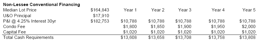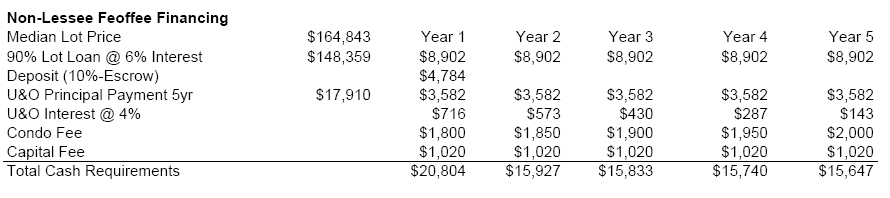 Again, we start with the median lot value (line 1). We assume that the lender allows the back rent to be rolled into the principal of the loan (line 2). We also assume that the cottage owner has sufficient equity in the cottage itself that no further cash deposit is required at closing to purchase the condo unit. The debt service is calculated on a 4.25% 30 year note (line 3), which may be optimistic for second home financing in this market; any higher rate or shorter term will obviously increase the cash requirements. Condo fees and capital assessments are added as before (lines 4&5), and again there is no allowance for legal fees that might be owed.