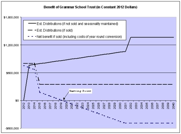 As is stated quite strongly in the interveners position statement, we do not believe that there is any legal basis for deviating the will of William Paine, since there is no evidence that the assets of the Trust cannot generate income for the beneficiaries. That said, we realize that there are plenty of people who believe that deviating the will could be acceptable, and for whom the only thing that matters is what outcome generates the best financial return for the beneficiaries. For that reason, we also offer this financial analysis of Sale vs. No Sale. Since originally publishing this, we have also received an expert opinion. Ken Swenson also had a nice rather more compact analysis in his recent letter to the editor and you can see him trying (and failing) to get an answer on the question of financial impact of year-round usage here.